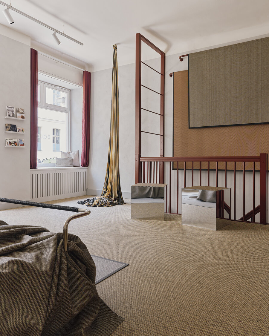 With In Bed with Bolon, we gave our Berlin showroom a new look. The starting point of this reimagining is two collections that rethink material, space, and atmosphere. Riff and BKB represent two closely connected design approaches: graphic precision meets textile calm, spatial exploration meets a sense of quiet luxury comfort.