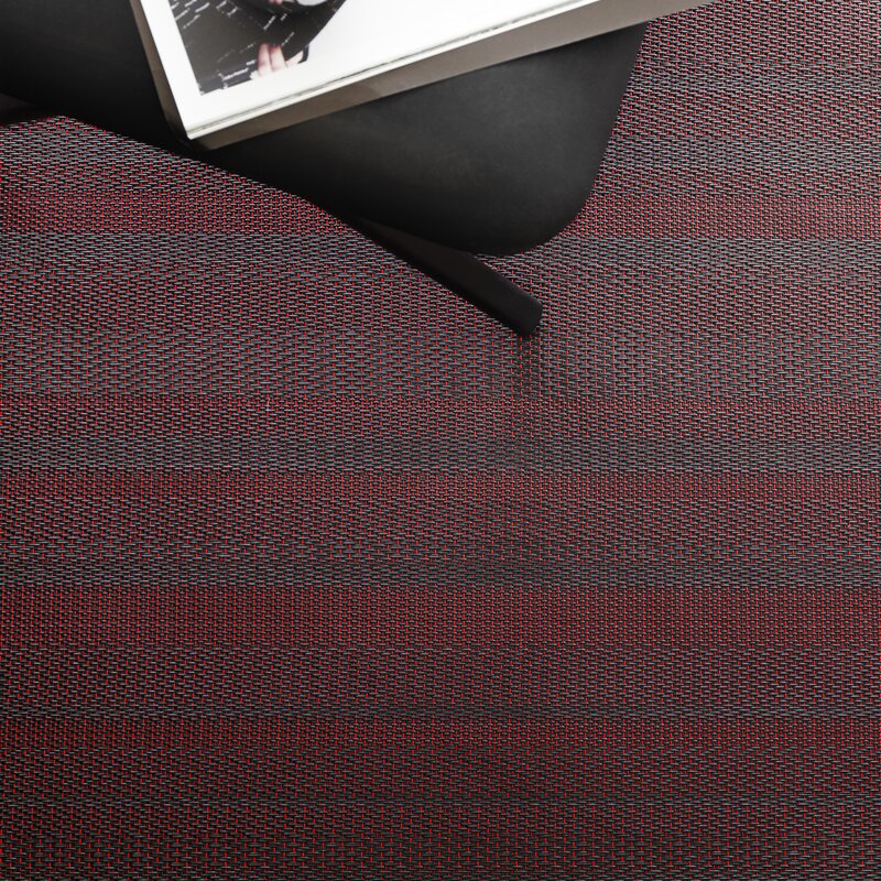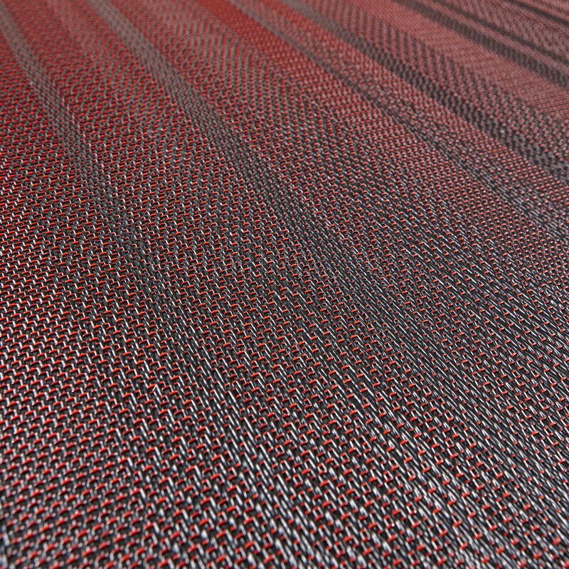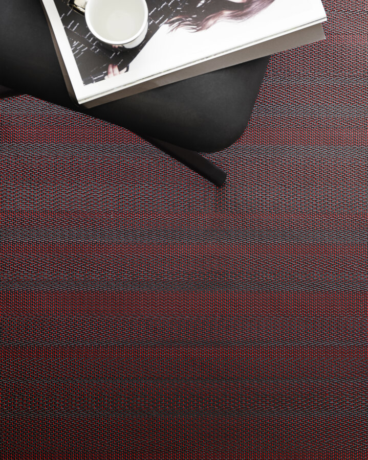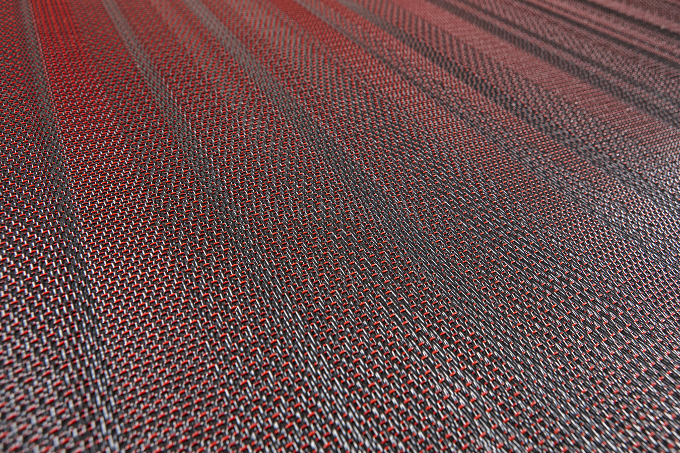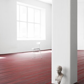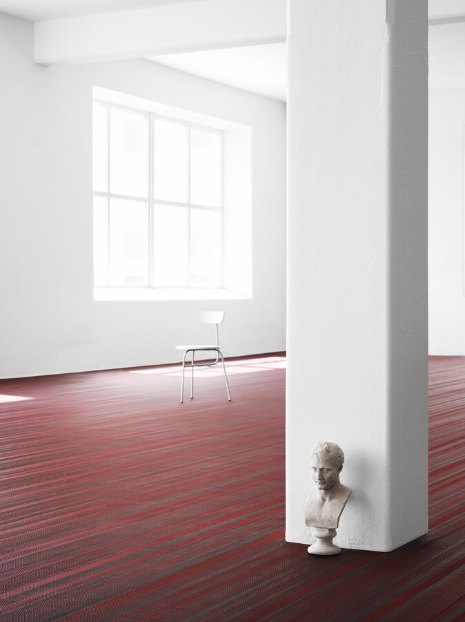 Handmade, industrial flooring with architectural sensibilities and a linear design that amplifies spatial geometry – No 2 features a red / light grey / dark grey colour palette.