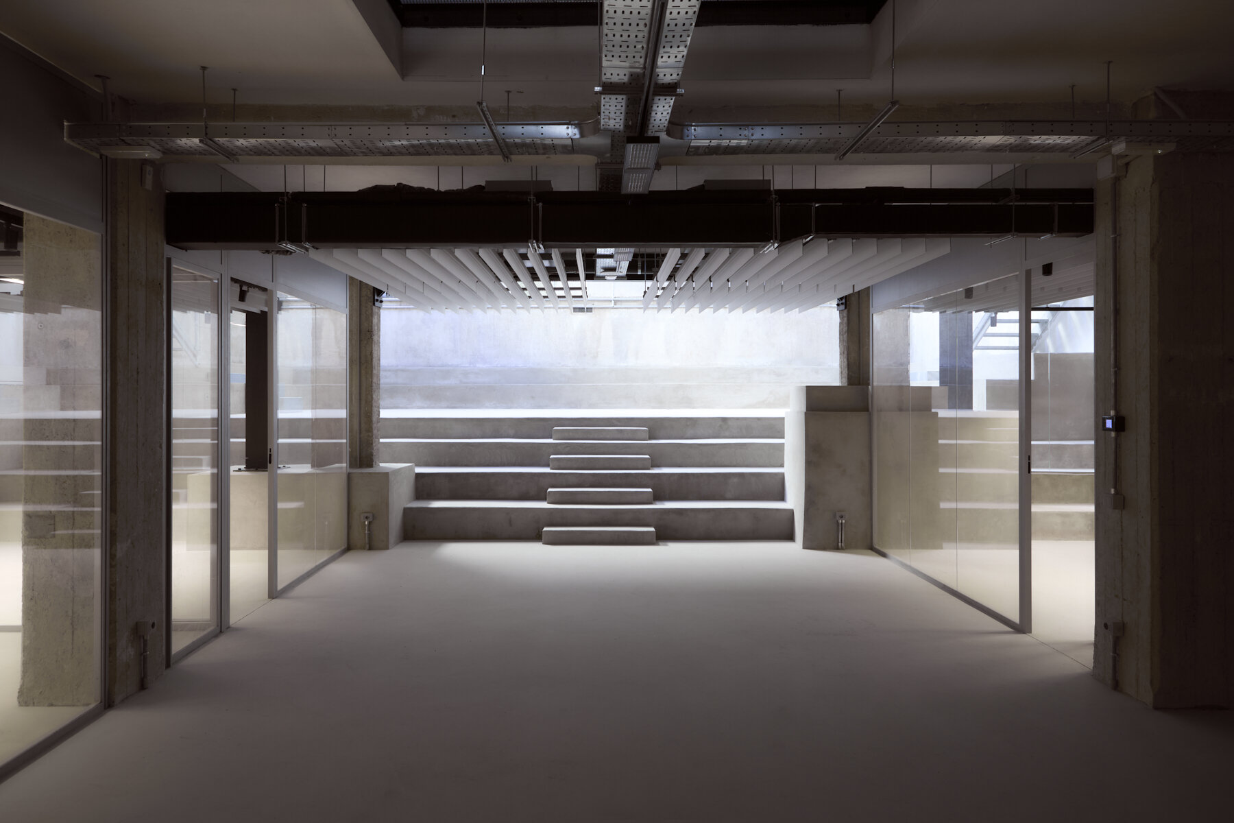 Näyttelytila, jossa perinteet ja tulevaisuus kohtaavat – kaarevia muotoja, tilaa hyödyntäviä ratkaisuja, materiaalien välistä kontrastia, paletti, joka on samalla sekä selkeä että vivahteikas.