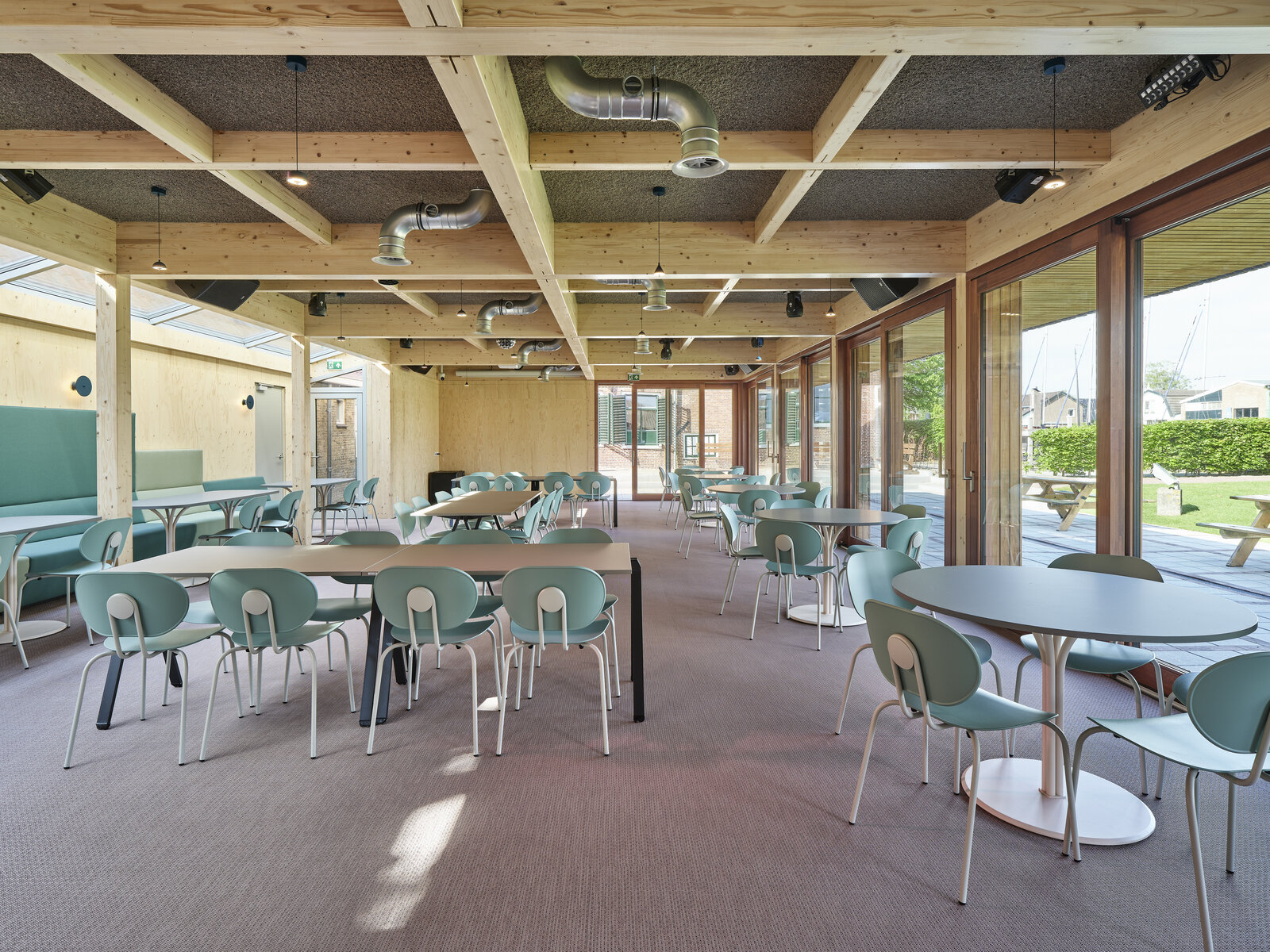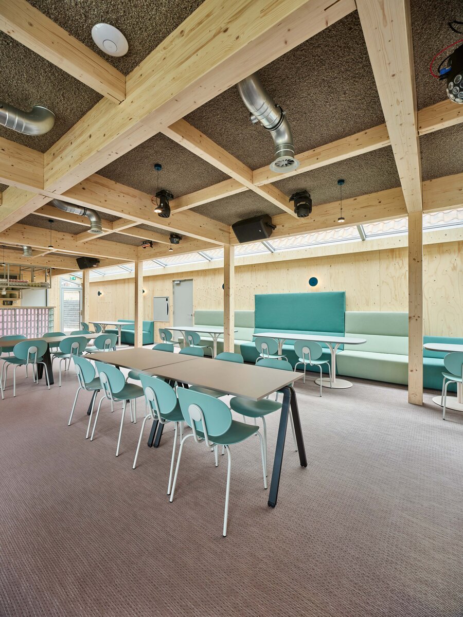 Visually, we wanted the new addition to connect with the site and its sawmill roots. Wood was the obvious choice – not just for the facade, but for the entire structure. It’s built from cross-laminated timber and finished inside with plywood. You could say the whole building is a celebration of wood. Architecturally, we aimed to distinguish the new structure from the more historic buildings. We wanted to create a modern addition with a bold, clean silhouette – a clear contrast to the rich detailing of the original architecture.