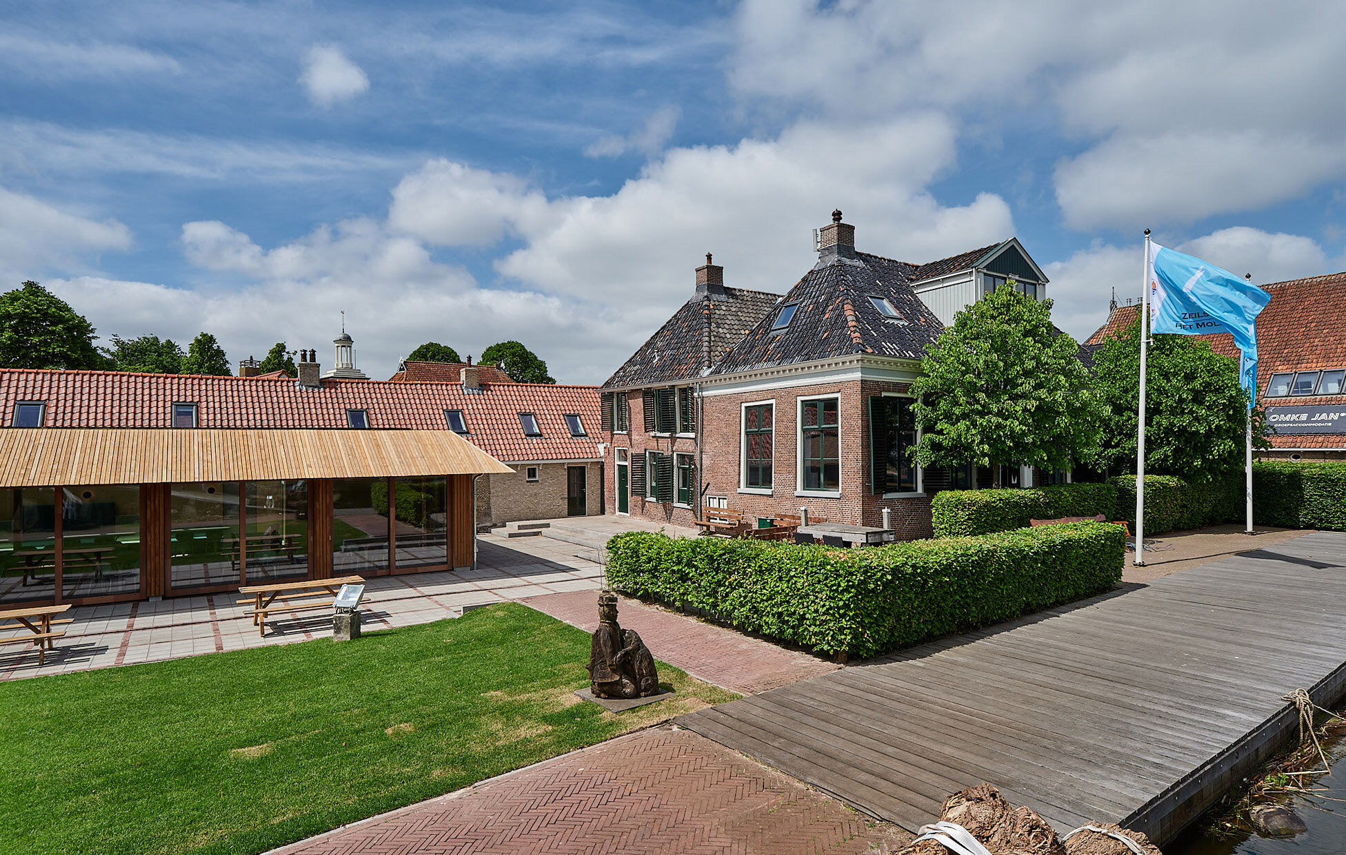 Another opportunity we saw was to physically and visually connect the building with its surroundings. The accommodation is beautifully situated by the water, along the Elfstedenroute, and next to a historic Dutch windmill. Originally, the entire complex was designed as an industrial site, intentionally shielding the working areas from view. As a result, there was very little connection to the landscape –only the main building faced the water. With the new addition, we wanted to open the building up to its environment and draw it in. We designed a full facade of floor-to-ceiling sliding glass doors, allowing guests not only to enjoy the view but to step directly into it. In summer, the boundary between inside and outside completely disappears.